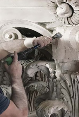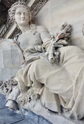 • Reprise en sculpture de greffes réalisées par incrustation numérique sur les trophées et les anges du fronton